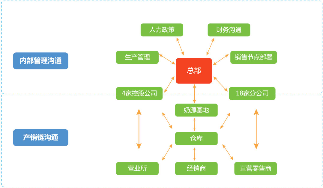 完达山的销售网络遍及全国,拥有多个奶源基地、仓库,全国有众多的经销商、直营网点。近年来,完达山的业务进入了高速发展期,导致了企业的沟通数量和沟通复杂度急速上升。在公司各部门之间、总部和分公司之间、公司和奶源基地之间、公司和仓库之间、公司和经销商之间,面临着数量多、复杂度高的频繁沟通。