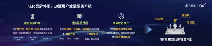 坚持把服务作为企业发展的根本,与时俱进完善品牌服务体系,不断满足用户个性化、多样化、定制化需求,切实提高用户的认知度、信任度、满意度。塑造服务口碑,坚持以用户为中心,深化全方位、全过程、全员服务体系建设,设立5G用户服务专席,提供不换卡、不换号、不办理即可入网的一站式便捷服务。联合产业链上下游锻造网络端到端优良品质,切实保障用户感知。推动品牌升级,围绕高端尊享、时尚趣味、实惠便捷等多样化需求,开展全球通、动感地带、神州行三大品牌焕新升级行动,创新推出家庭、政企市场品牌,彰显有品质、有品味、有品德的品牌形象。加强联合推广,面向合作伙伴搭建品牌共享共创平台,创新品牌授权、合作运营等模式,统筹积分、折扣、触点等各类资源,强化品牌联合推广、促销、服务,释放品牌溢出效应。