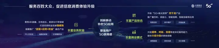 顺应用户信息消费需求变化,创新推广具有移动特色的5G应用,让广大用户在共享5G发展成果上拥有更多获得感。丰富业务权益,聚焦4K直播、在线音乐、VR/AR、旅游出行、电子商务等领域,打造优质头部权益“强磁场”,加强金融、合约、会员等权益合作和联合运营,规模推广“连接+应用+权益”融合产品。丰富产品形态,升级“5G+极光宽带”双千兆产品,深化大屏运营,推广和家亲、AI交互、家庭云等智能应用,打造智慧安防、家中看护、环境监测等一体化解决方案。丰富商业模式,根据业务、服务、用户等不同属性,开放速率、时延、连接等5G网络差异化服务能力,提供分层分级的网络保障,促进创新应用的商业变现。