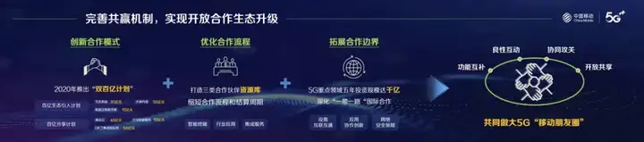 立足5G全球化分工、协同化推进的发展特征,加快打造功能互补、良性互动、协同攻关、开放共享的新型合作生态,共同做大5G“移动朋友圈”。创新合作模式,发挥超高清视频联盟等作用,深化内容生产、制作、分发的全产业链合作,打造用户共享、内容共用、发展共商的合作模式。加强5G泛智能终端合作,推动终端多模、多频、多形态发展,降低使用门槛、提升操作性能。2020年将推出“双百亿计划”,聚合权益、终端、内容等优质资源,深化合作成果共享。优化合作流程,依托产业数字化联盟,打造智能终端、行业应用、集成服务三类合作伙伴资源库,大幅缩短合作流程与结算周期,快速牵引合作项目落地。拓展合作边界,发挥资本连接、聚合作用,完善5G重点领域投资布局,力争未来5年投资达千亿规模。积极响应“一带一路”倡议,深化与全球合作伙伴在基础设施互联互通、应用协作创新、网络安全保障等方面的交流合作,共建网络空间命运共同体。