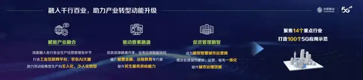 联合垂直行业的优质合作伙伴,挖掘个性化长尾需求,聚焦14个重点行业打造100个5G应用示范,助力千行百业数字化转型。赋能产业融合,推动5G深度融入各行各业生产经营管理各环节,打造工业互联网平台、农业AI大脑,探索推进智慧工厂、智慧电网、智慧农田等建设,助力劳动密集型生产向无人化、少人化转型。驱动要素融通,打通信息壁垒和数据孤岛,促进信息资源融通共享、业务应用智能协同,创新推广智慧金融、远程教育等信息化解决方案,提升民生服务供给能力。促进管理融智,努力成为领先的新型智慧城市运营商,推进智慧城市建设、运营、服务一体化,推动城市智慧大脑、应急指挥等智能平台规模应用,不断提升城市治理效能。