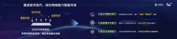 坚持以SA为目标架构,充分发挥2.6GHz与4.9GHz双频协同带来的覆盖、容量优势,强化5G与AICDE融合创新,打造“覆盖全国、技术先进、品质优良”的5G精品智能网络。打造云网融合能力,加快网络云化转型,建强云基础设施,拓展“固定+移动”多种接入方式的应用场景,融合5G端到端网络切片特性,打造云网边协同、泛在智能的一站式“移动云”服务。打造智慧中台能力,建设人工智能共享平台,强化数据深度挖掘和融合应用,打造关键共性AI能力,支撑内外部产品联合创新。打造安全保障能力,深化区块链等技术应用,强化全方位网络安全态势感知和集中管控,提供数据、应用、主机防护等超50项安全保障服务。
